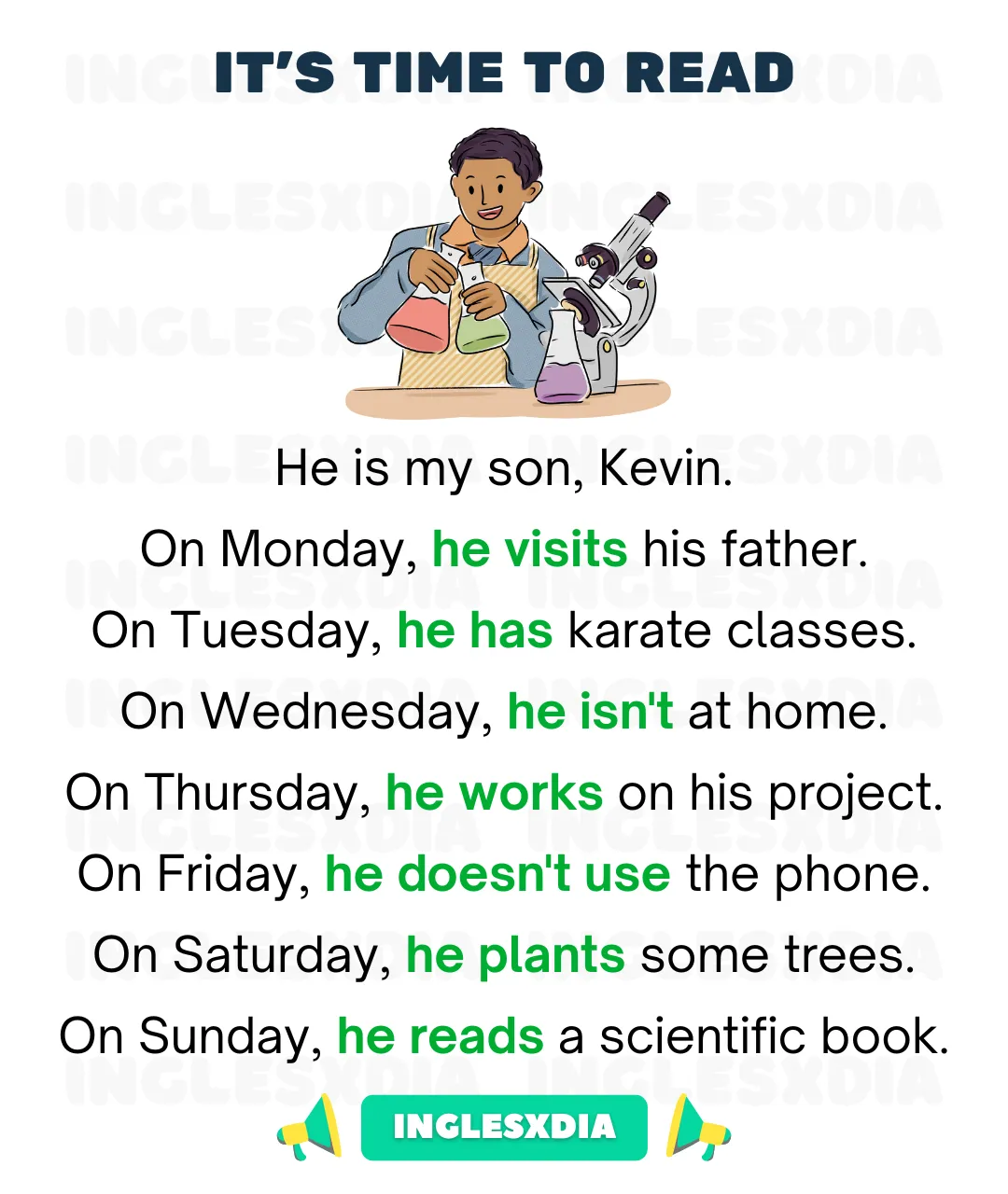 - On Sunday, he reads a scientific book. El domingo, lee un libro científico.